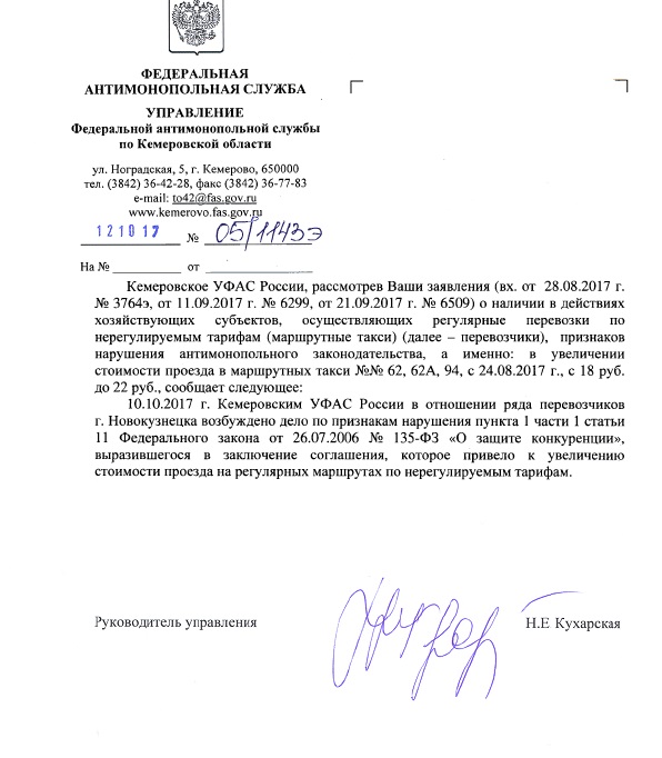 Новокузнечанин Александр не стал мириться с повышением цен на проезд в маршрутках и написал заявление в ФАС. Горожанин сообщил надзорному органу, что в частных автобусах маршрутов №№62, 62а, 94 с 24 августа 2017 года плата за проезд составляет не 18, а 22 рубля. В Федеральной антимонопольной службе заявителю ответили, что в отношении ряда городских перевозчиков возбуждено дело о нарушении ФЗ "О защите конкуренции", их подозревают в сговоре.
